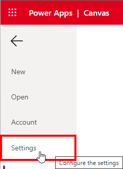 In the Power Apps editor, open menu File and Settings.