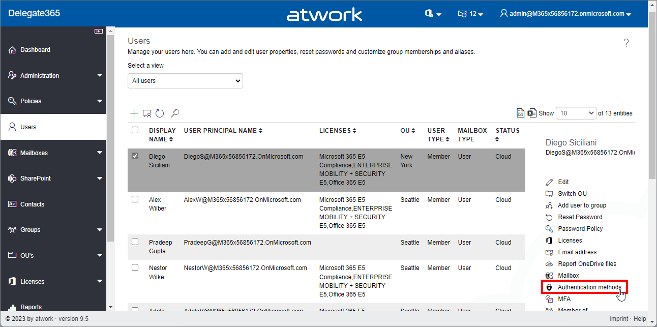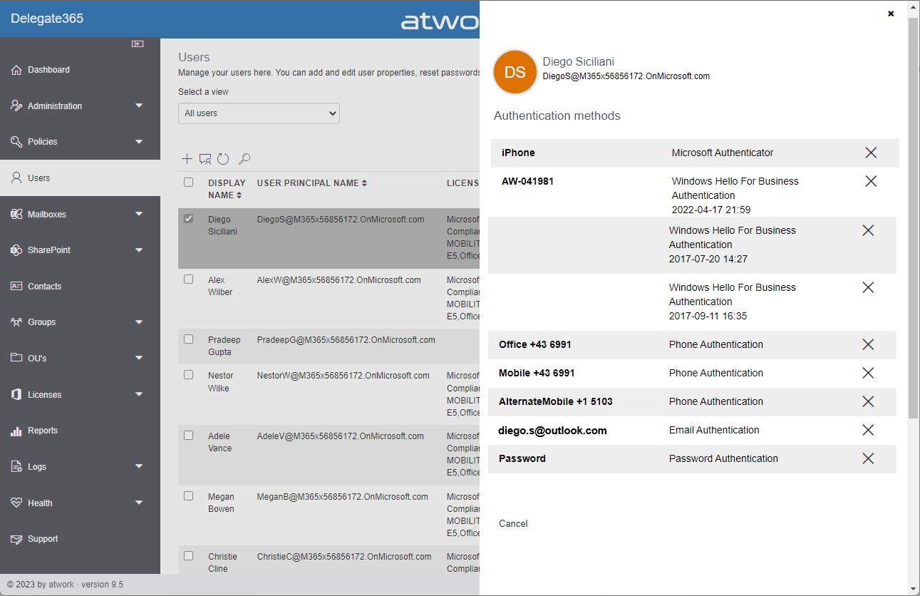 User authentication methods: In the *Users *module, the panel has been extended and now shows all stored Authentication methods of the user. Select a user, and open the Authentication methods menu on the right.