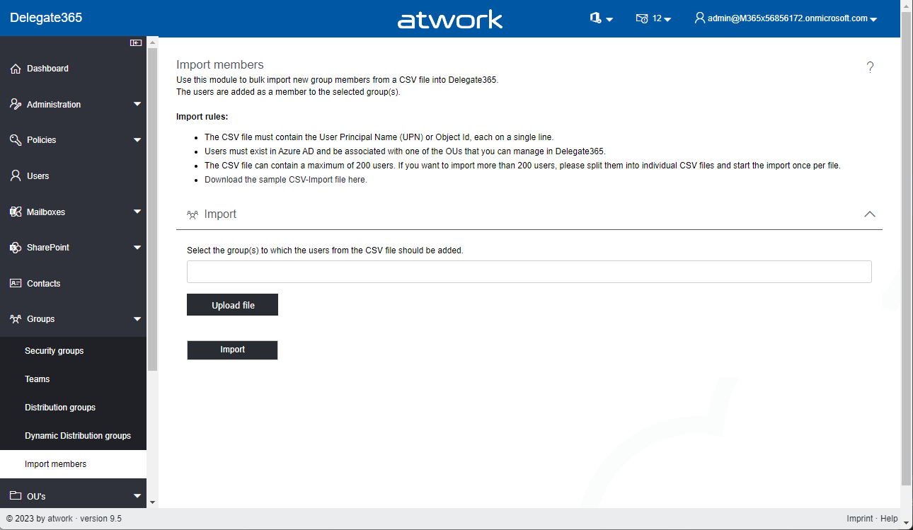 Note: Users can modify or add their authentication methods anytime at https://aka.ms/mfasetup.Import members: In the Groups module, the new module Import members allows to add users from a CSV file into M365 groups. The import rules inform about the requirements:
