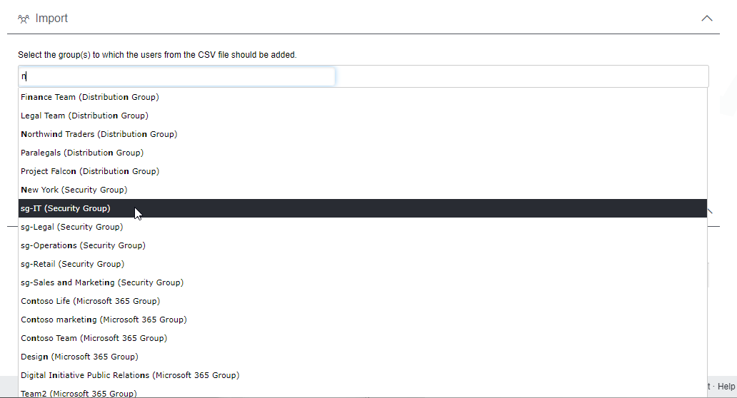 Select the group or multiple groups to which the users from the CSV file should be added. Type a part of the group name, and select one or more groups, as here.
