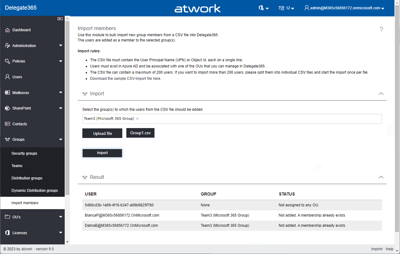 The Result pane shows a list of success or error in the Status table column when the users are added. The list shows one line per user. If a user was added, the status Says “Added”. If the user already was a member of the group, the Status says “Not added. A membership already exists.”. If the user was not found in Azure AD and Delegate365, or the user is not assigned to an OU of the admin, the Status says “Not assigned to any OU.”.