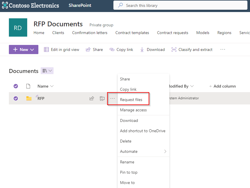 The user who wants to collect files has now a new option in his context men in the document library. First, he creates a folder RFP – where all files will be collected. After that he can create the File request.