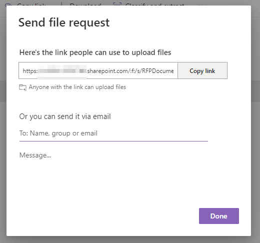 By clicking next our user can now copy the link for the file request or send it directly to the people.
