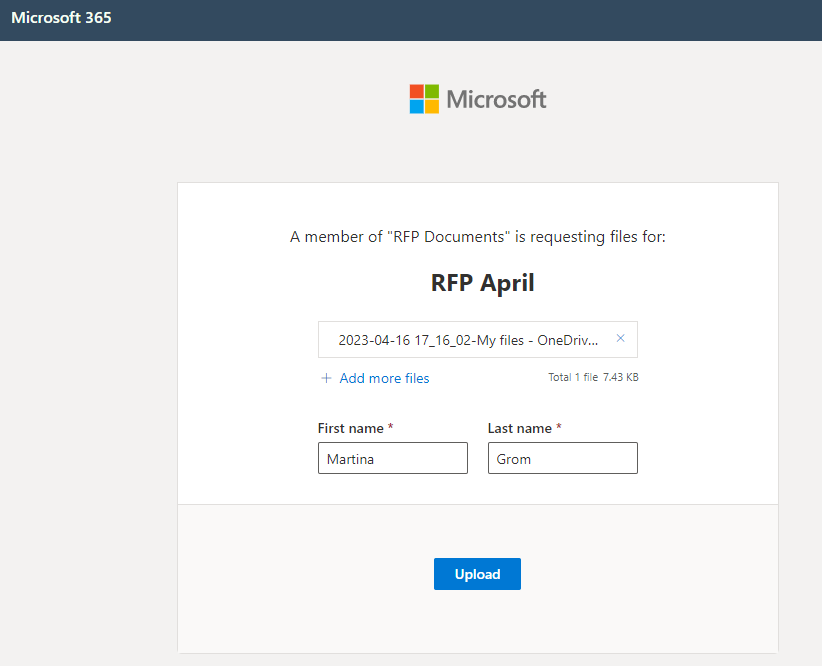 After the requested link is delivered to the users they are able to upload the files. No sign-in is required or a specific Microsoft account. The recipient clicks on the link, select files and gets a dialogue, where he can record his name. This helps to identify who uploaded the files.