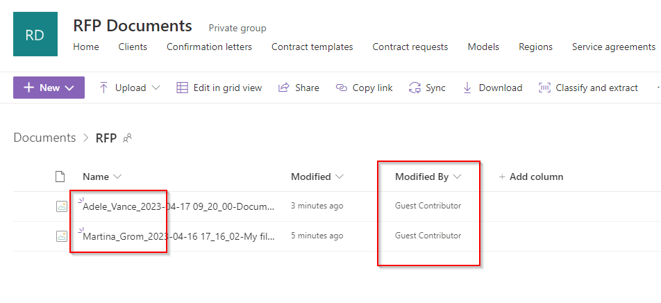 After the whole configuration we are now ready to use the feature. In my example we created a SharePoint Team site to collect RFP documents from different potential vendors. The configuration to make request files available are already set.