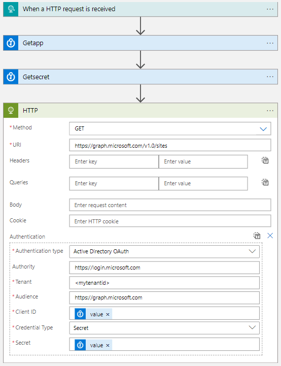 With this Authentication, we can run the query. The Authority is https://login.microsoft.com, and the Audience is https://graph.microsoft.com. Here, I use an Azure Logic App, and read the App Id and the App secret from a Key Vault, as here.