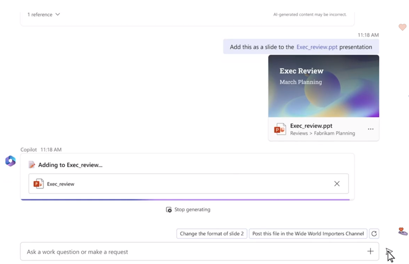 And Copilot will be able to do things like “Add this slide to an existing Power Point presentation”, and similar operations.