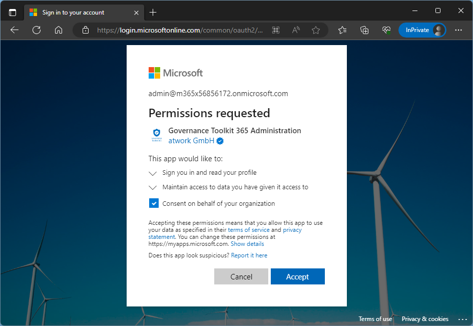 This application asks for permission in your tenant. It requires the sign-in permission “Sign you in and read your profile” with your organizational account and let the app read your profile. This permission also allows the app to read basic company information, like the Tenant Id, organization name, and some other basic tenant properties. “Maintain access to data you have given it access to” allows the app to see and update the data you gave it access to, even when you are not currently using the app. This does not give the app any additional permissions.