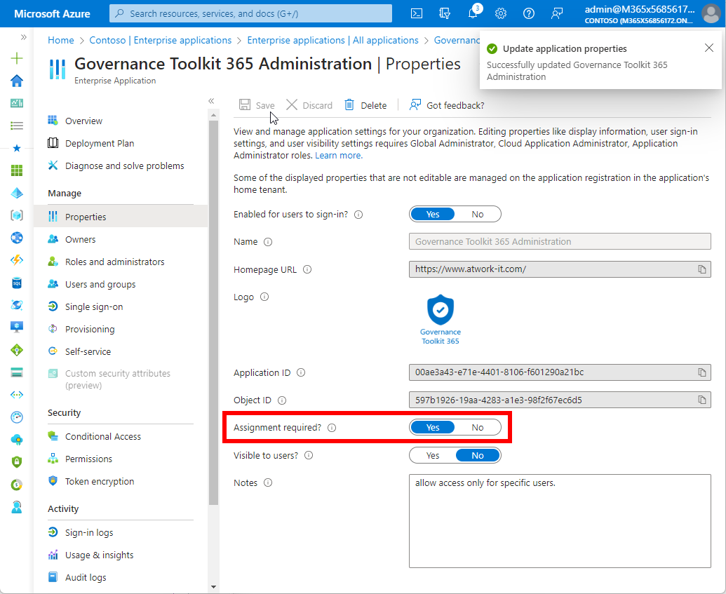 By default, every user in your organization has access to the application (if not already restricted). Now, we want to restrict access only for specific users because in our case, it´s an app, that only a handful of administrators shall have access to. We navigate to the app Properties, and change the “Assignment required?” switch from No to Yes. If this option is set to yes, then users and other apps or services must first be assigned this application before being able to access it. That is exactly what we want to achieve.