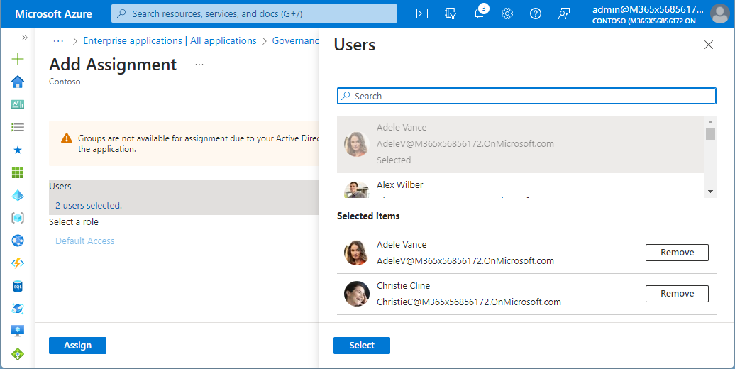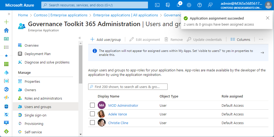 When the users or groups are selected, we click on the “Assign” button. The Global Admin (my user) already was added before. So here we see three users that get access.