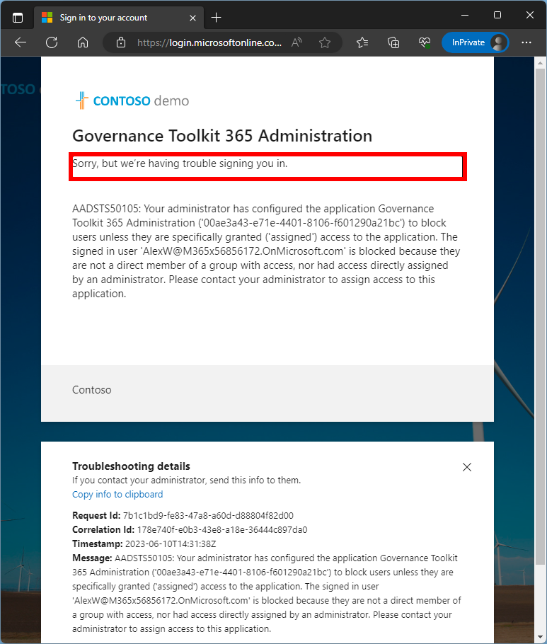 The message also informs the user that the administrator has configured the application to block users unless they are specifically granted (‘assigned’) access to the application.