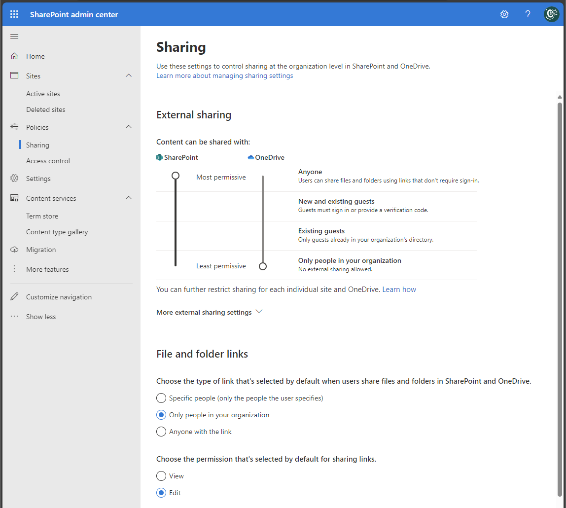 Global Sharing settings: In the SharePoint Admin Center, Global Administrators can control the sharing settings for their Microsoft 365 tenant (see more at Manage sharing settings for SharePoint and OneDrive in Microsoft 365). These settings apply to the entire organization in SharePoint and OneDrive. The screenshot below shows a typical setting for organizations that allow external and anonymous sharing to certain SharePoint sites, but want to restrict sharing from the OneDrive personal space.