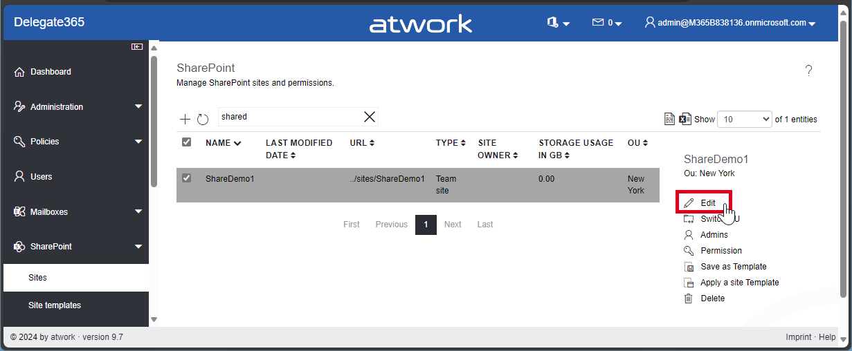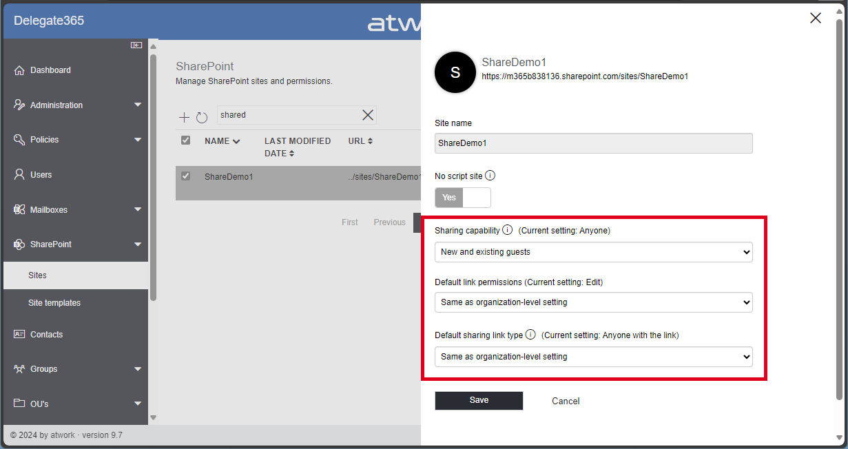In December and January some features and fixes have been added to Delegate v9.7. In this update, administrators can allow or block sharing settings of SharePoint sites to comply with company policies.