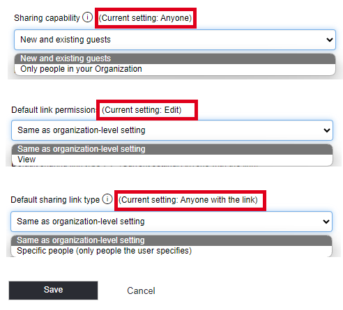 *Default sharing link type *is the default selected option when users share files and folders on this site.