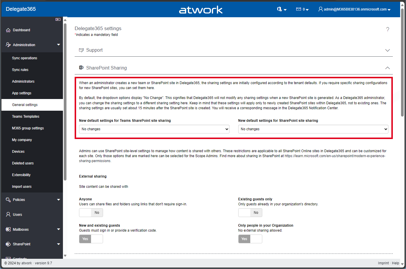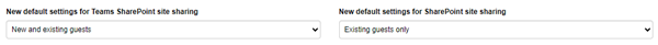 When an administrator creates a new team or SharePoint site in Delegate365, the sharing settings are initially configured according to the tenant defaults. If you require specific sharing configurations for new SharePoint sites, you can set them in the SharePoint sharing section.