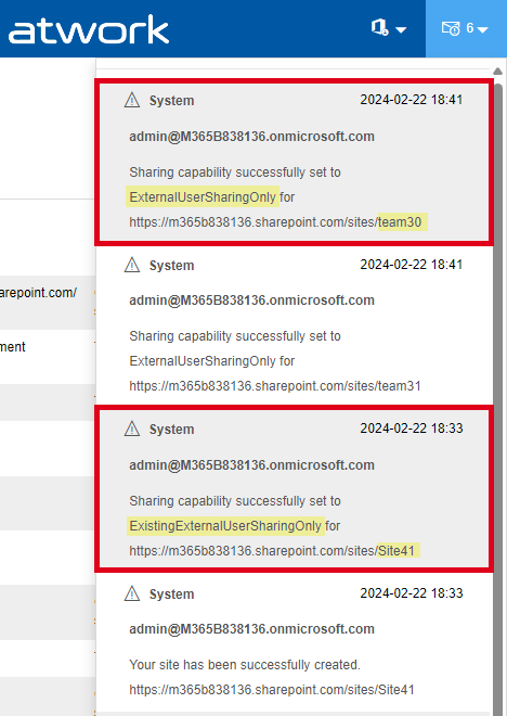 Click Save below when done. Keep in mind that these settings will apply only to newly created SharePoint sites within Delegate365, not to existing ones. The sharing settings are usually set about 15 minutes after the SharePoint site is created. You will receive a corresponding message in the Delegate365 Notification Center, as here: