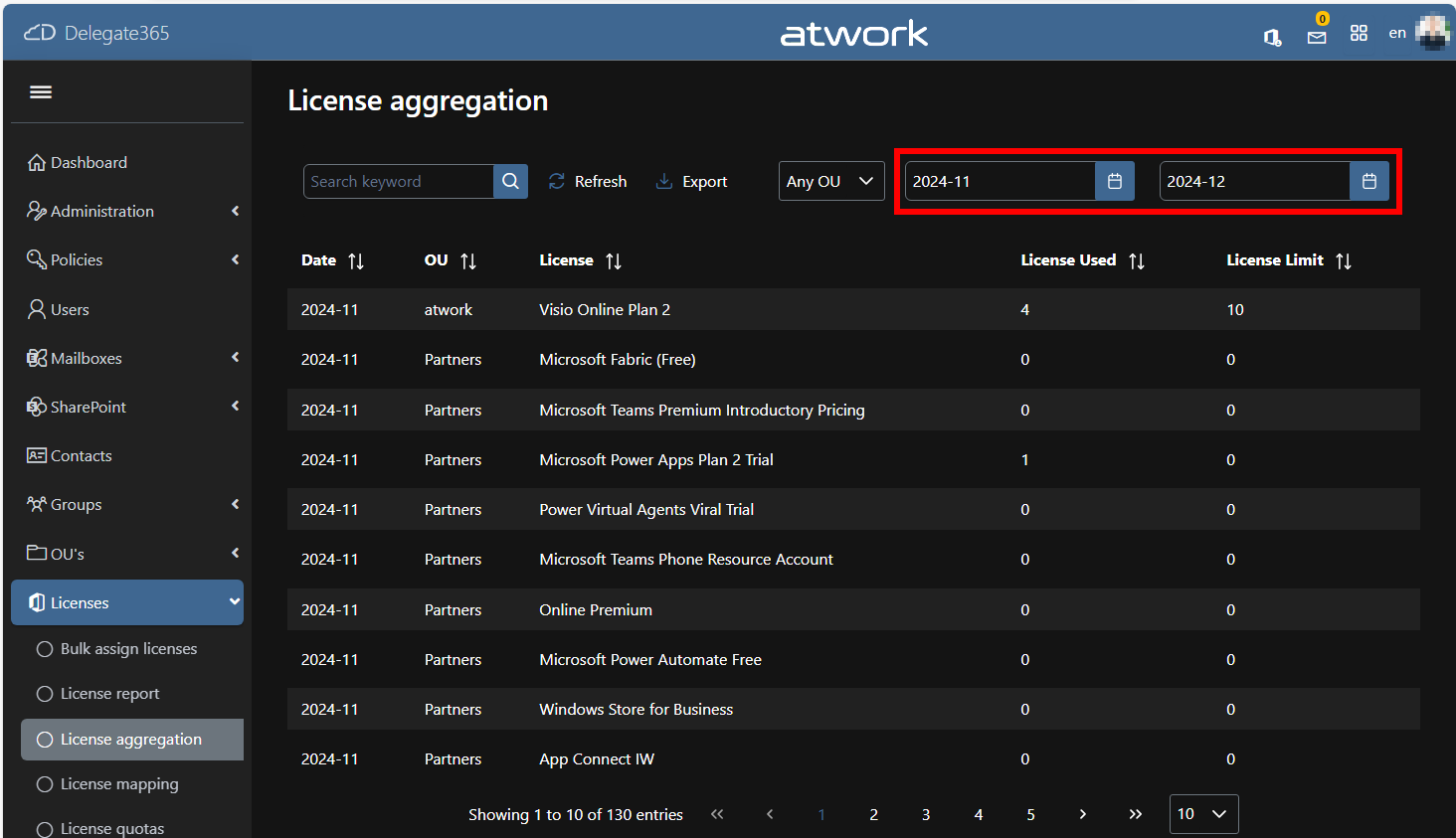 - Enhanced Reporting: In Delegate365 v10, you can now access year-month data for each OU and all licenses.