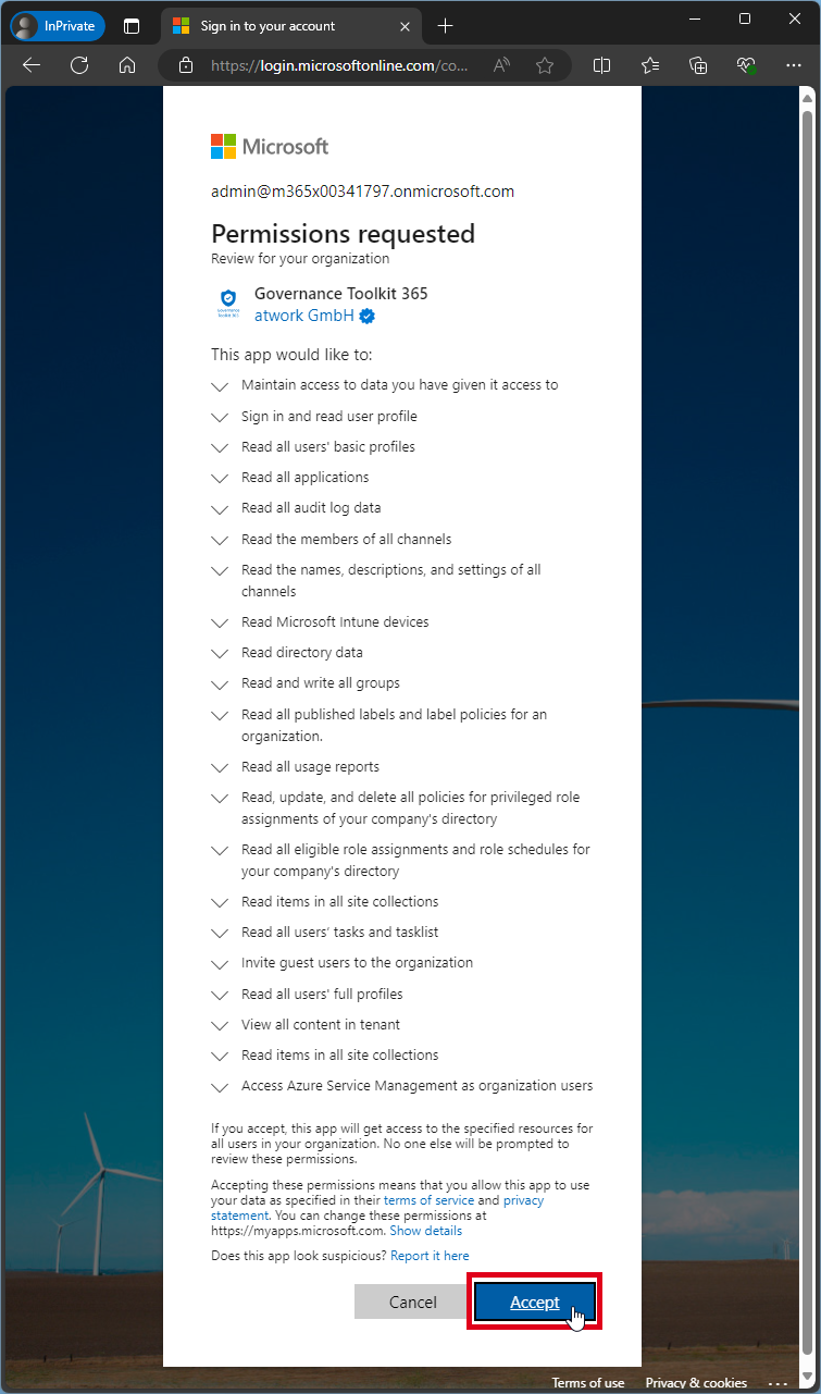 Now open the URL https://bit.ly/gt365app2 to grant access to the Microsoft Power BI services. (If the short URL does not work in your environment, use the long URL here.)
