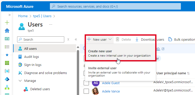 - Open the Azure portal and navigate to Microsoft Entra ID / Manage / Users: Users - Microsoft Azure