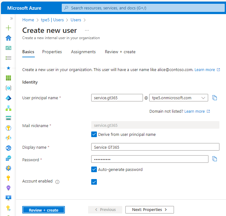 - Enter a name for the service account. Give the service account a name. Here we use service.gt365 and any domain. You can use any username and password. Then, click on Review + create.