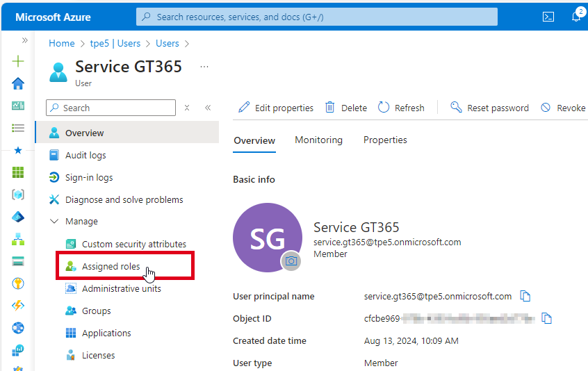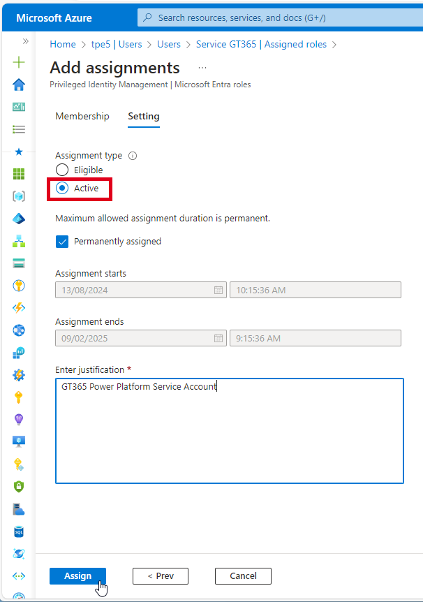 - Change the Assignment type to Active and enter a justification for this role, such as “GT365 Power Platform Service Account”. Then, click on Assign.
