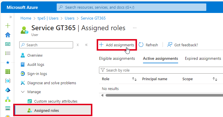 - We need to add the Power Platform role to this account. Click on Add assignments.