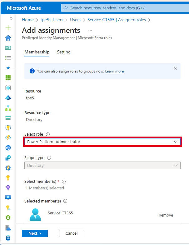 - In the* Select role* dropdown, select the “Power Platform Administrator” role as here. Click on Next.