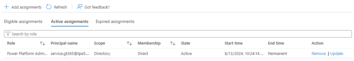 Note: Unfortunately, the Power BI services requires the service account to have a permanent role. It does not work (currently) if the service is used without an active role. - Azure confirms the role assignment with a notification message. In the Assigned roles list, click on Refresh to see the Active assignments, as here.
