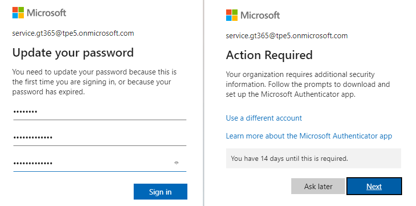 - Ensure that you have a valid password and MFA set for the new service account (to use it as described in step 3). Follow the sign-in process for the new account.