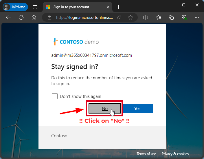 When the “Stay signed in?” prompt follows, ensure to click on “No”!