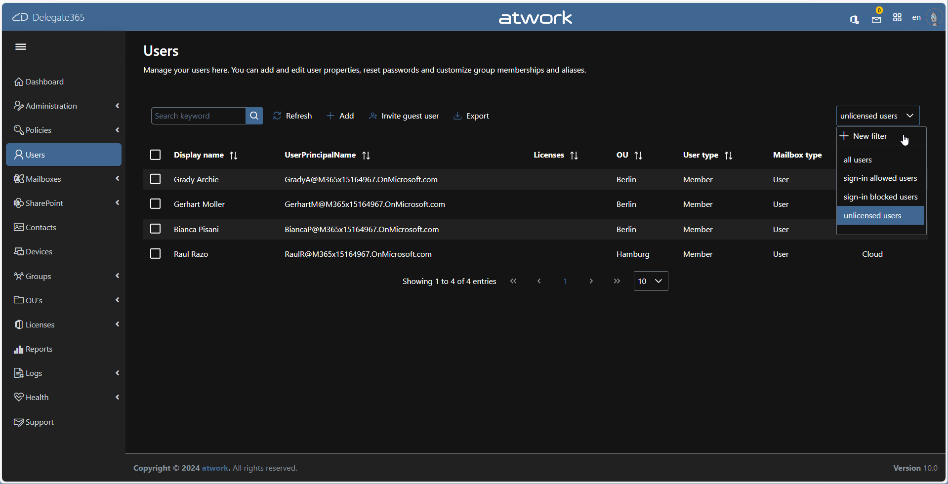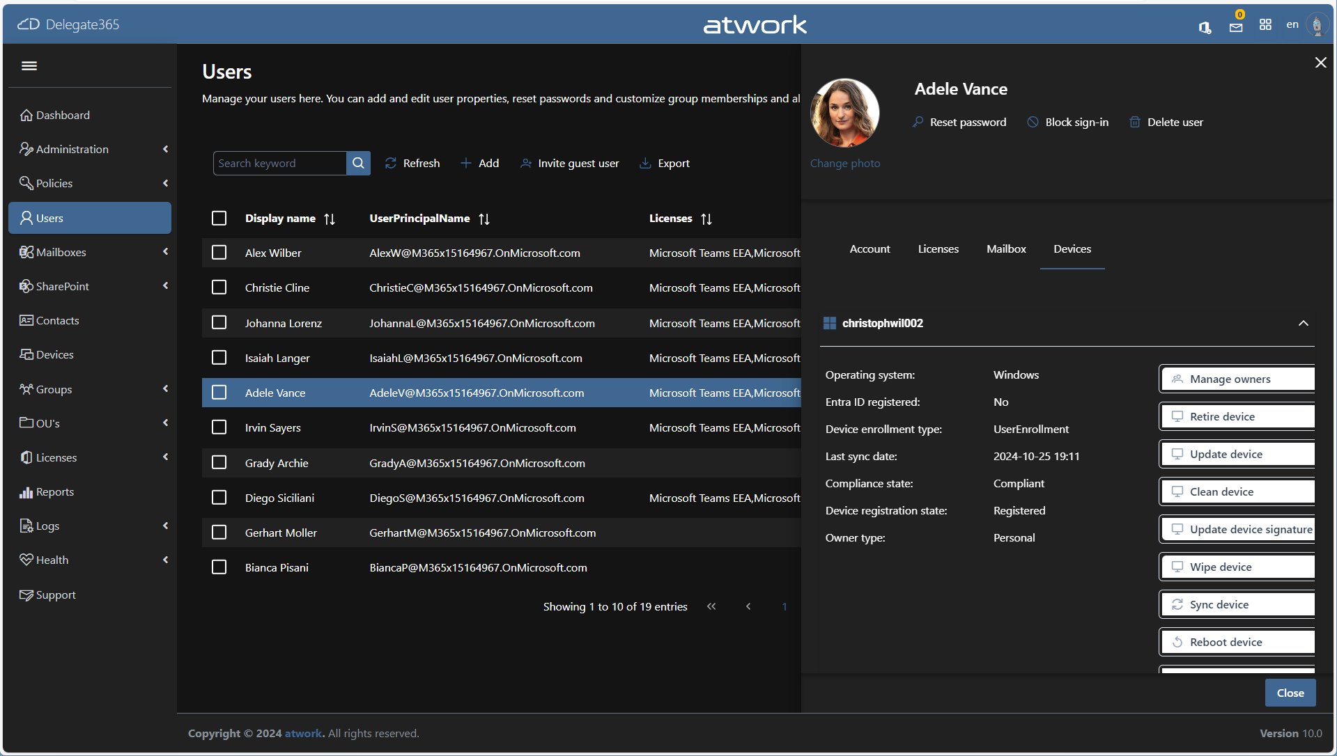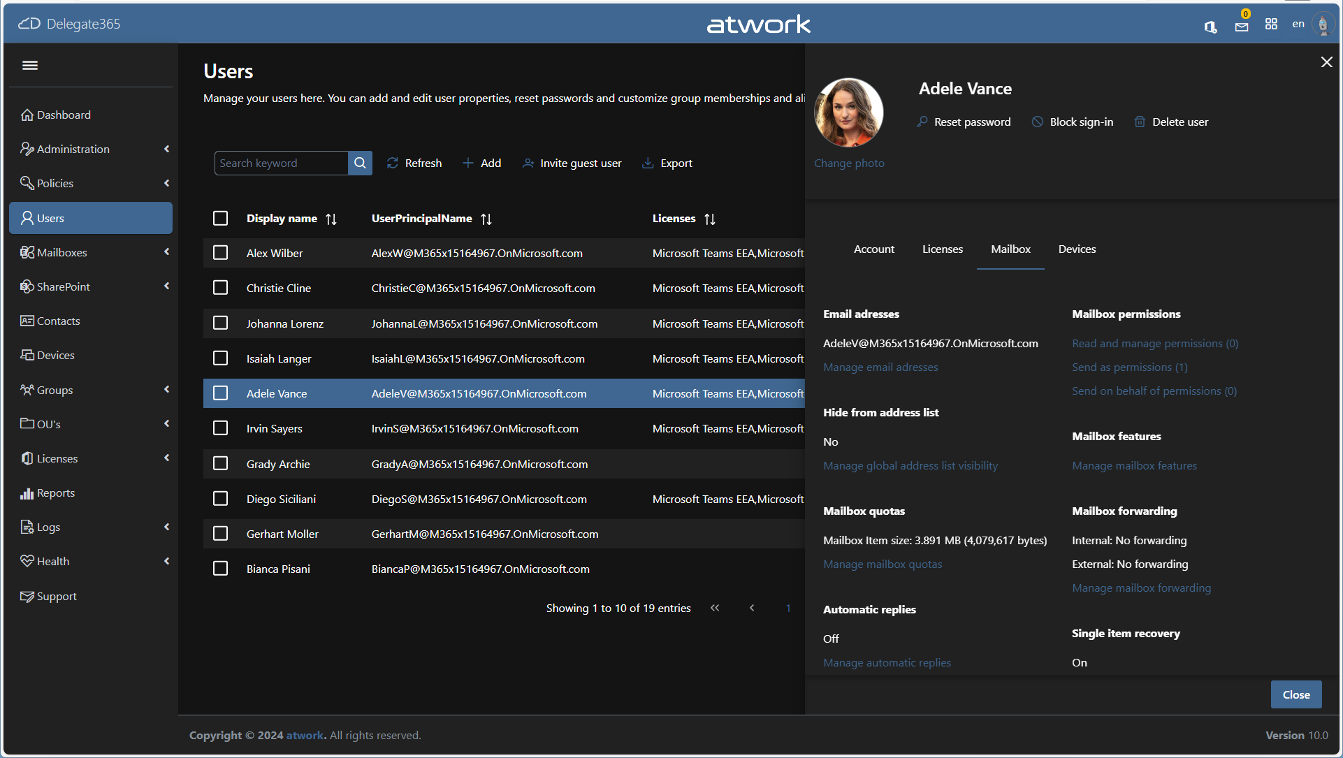 Over the past year, our team at atwork has dedicated countless hours to rebuilding Delegate365 from the ground up. This project was driven by our commitment to deliver a solution that is not only fully compatible with the existing version, but also fast and efficient. We carefully planned and implemented each development phase, ensuring that every component of Delegate365 meets performance and reliability standards. Our journey involved extensive testing to guarantee that the new Delegate365 operates seamlessly under various conditions. This thorough testing process was critical to refining the solution and allowed us to identify and fix potential issues before release. The new Delegate365 version 10 is currently available in test mode for customers.