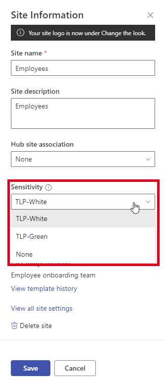 For a SharePoint site, site admins can set sensitivity labels in the Site information, as here.