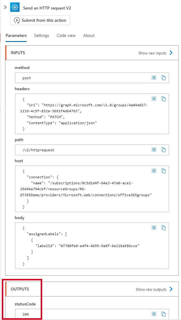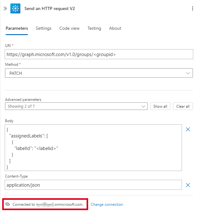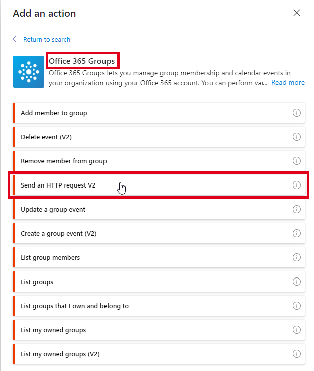 So, we can do this for example with an Azure Logic App and the “Office 365 Groups” action. This method includes an action “Send an HTTP request V2” and creates an API connection with a user account that authenticates against Microsoft Graph.