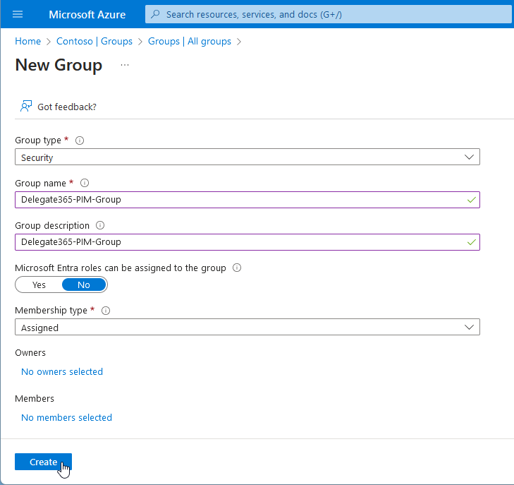 - Create a new security group. Here, we name this group “Delegate365-PIM-Group”, and click on Create.