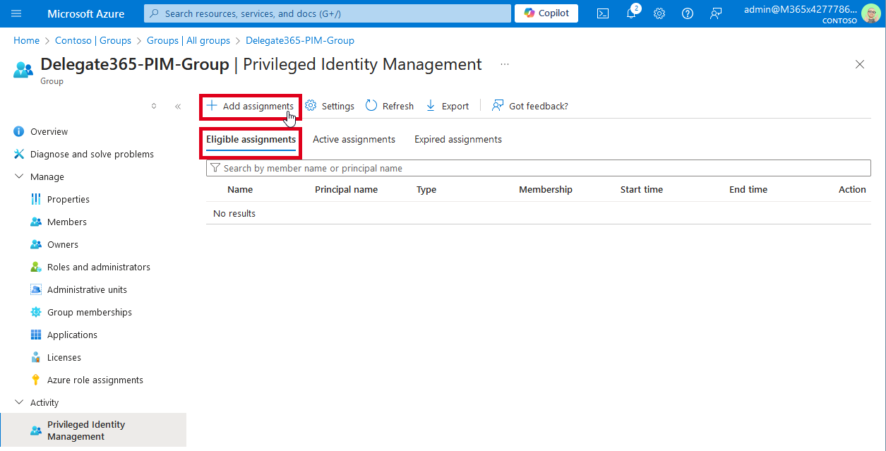 - Now we add members to the eligible PIM settings. Click on Eligible assignments and then click on Add assignments.