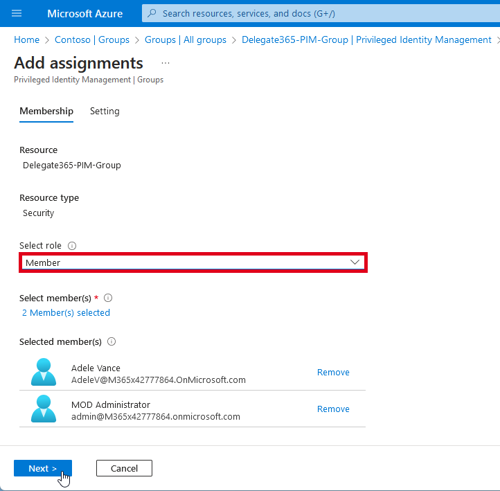 - in the Add assignments page, select the role Member, and add the users that shall get access. In this sample, we add the users admin, and AdeleV. When done, click on Next.