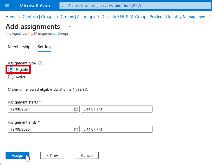 - Configure the assignment type to Eligible and the time frame as needed. Confirm with the Assign button.