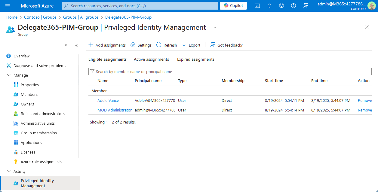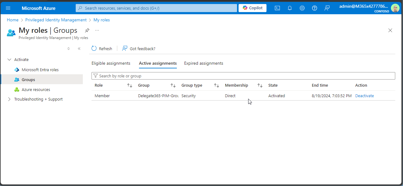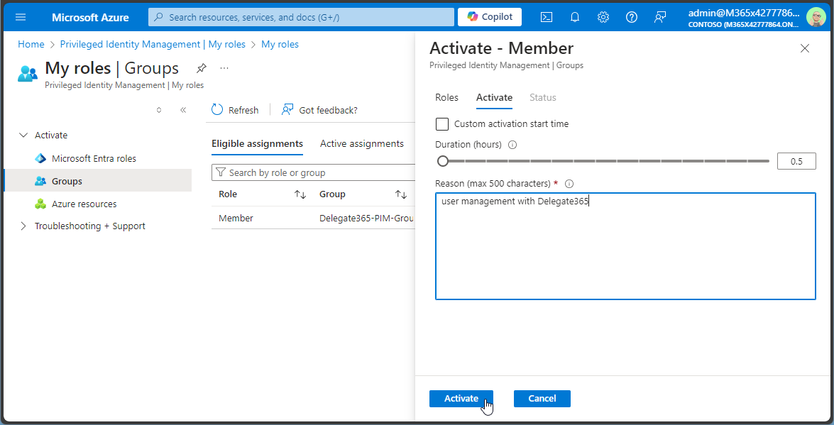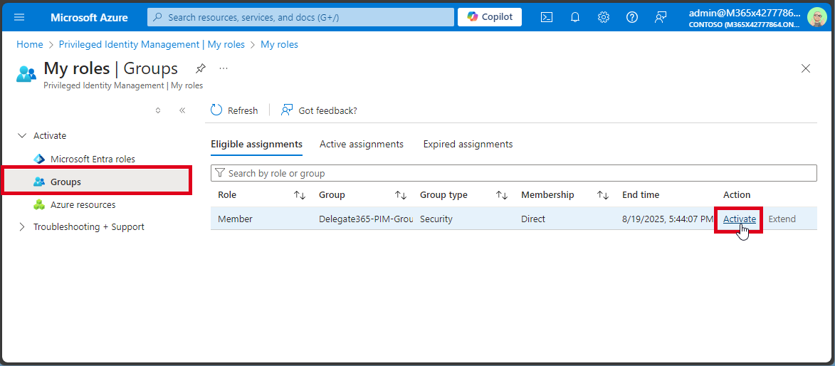 Click on Activities / Groups. In Eligible assignments, the group “Delegate365-PIM-Group” should show up. Click on the Action Activate on the right side to activate the membership for this group.