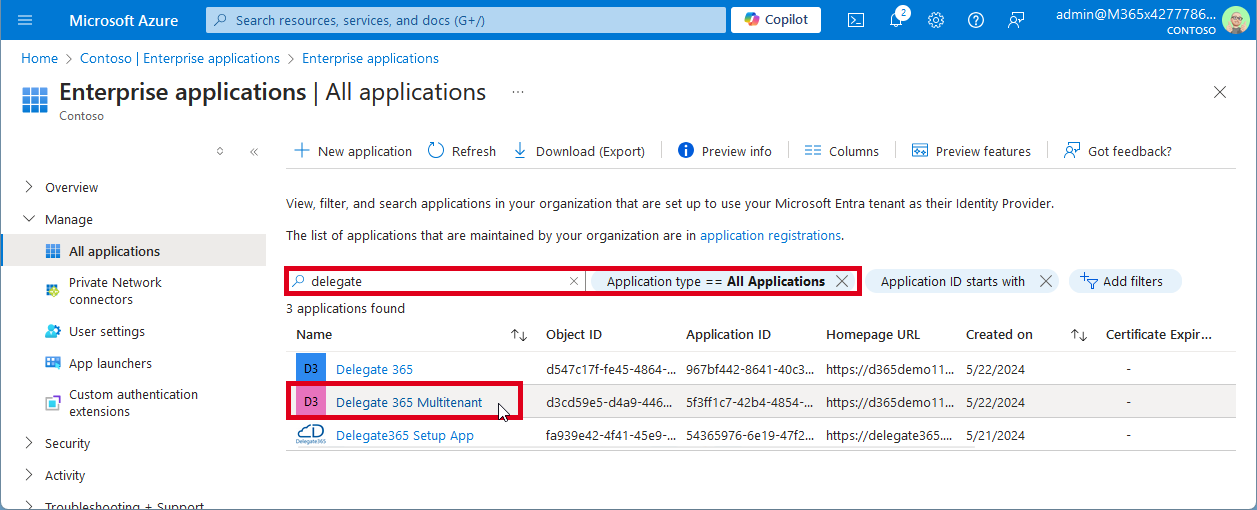 - In the Enterprise applications, search for “Delegate”, and set the filter *Application type *to All Applications to see all apps. Click on the “Delegate 365 Multitenant” app. This app is used for the login process.