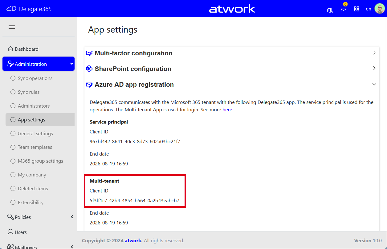 You can find more information about the apps under Delegate365 Applications. - Note: If you find multiple apps named “Delegate 365”, you can find the current app in Delegate365, in Administration / App settings menu as here. In this sample, we identify the Multi tenant app with the Application Id “5f3ff…”.