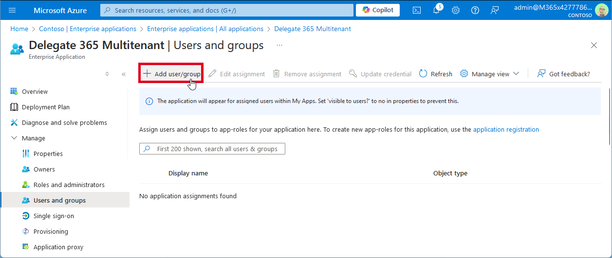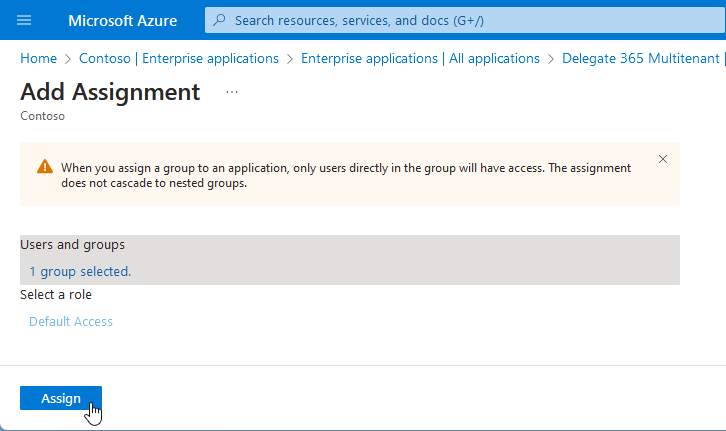 - Now we have configured the Delegate 365 Multitenant app to be only accessible for members of that group. The configuration is completed.