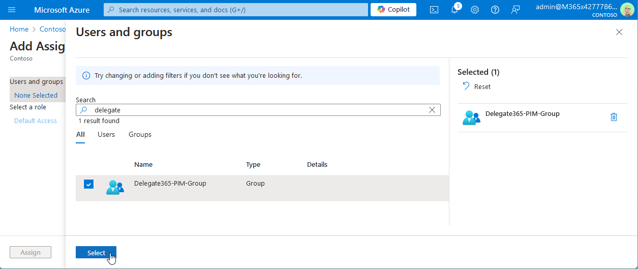 - Click on the link None selected below Users and groups. Search for the group “Delegate365-PIM-Group” and select it. When done, click on Select.
