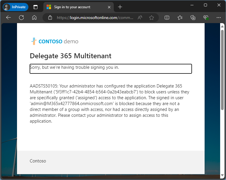 “Your administrator has configured the application Delegate 365 Multitenant (‘5f3ff1c7…) to block users unless they are specifically granted (‘assigned’) access to the application. The signed in user ‘admin@M365….onmicrosoft.com’ is blocked because they are not a direct member of a group with access, nor had access directly assigned by an administrator. Please contact your administrator to assign access to this application.”