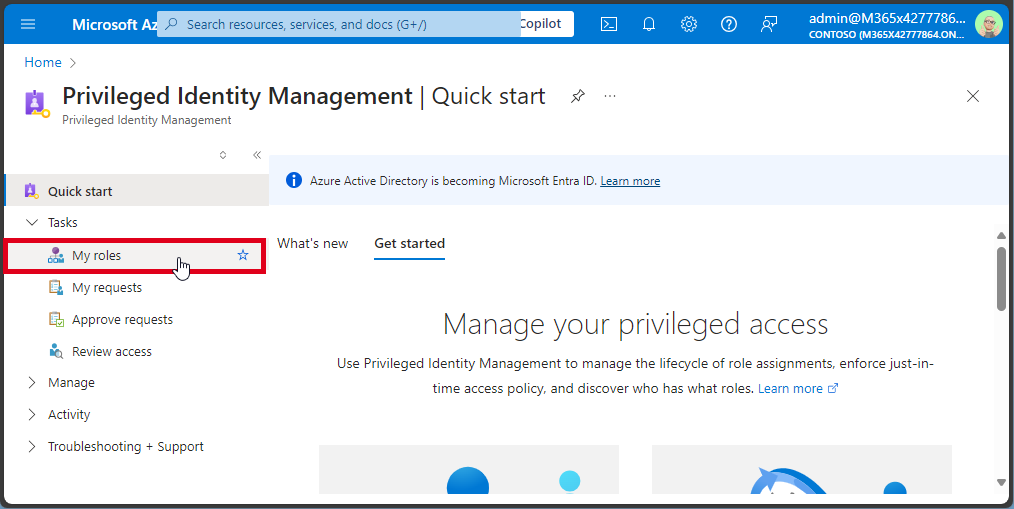 Search for “Privileged Identity Management “. Click on Tasks / My roles.