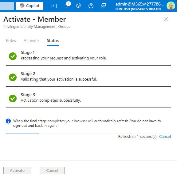 Now let´s activate our group with PIM and sign-in. Follow the steps here, or see the article at Activate a Microsoft Entra role in PIM.