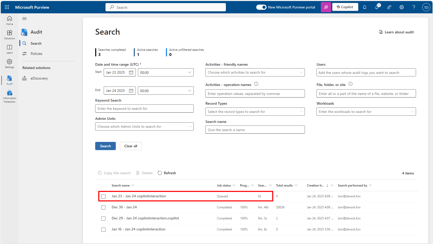 When the search is completed, we should find matching records. In this sample, a user used the Copilot Web search. The data can be exported as CSV file (and this takes a while to be generated as well).