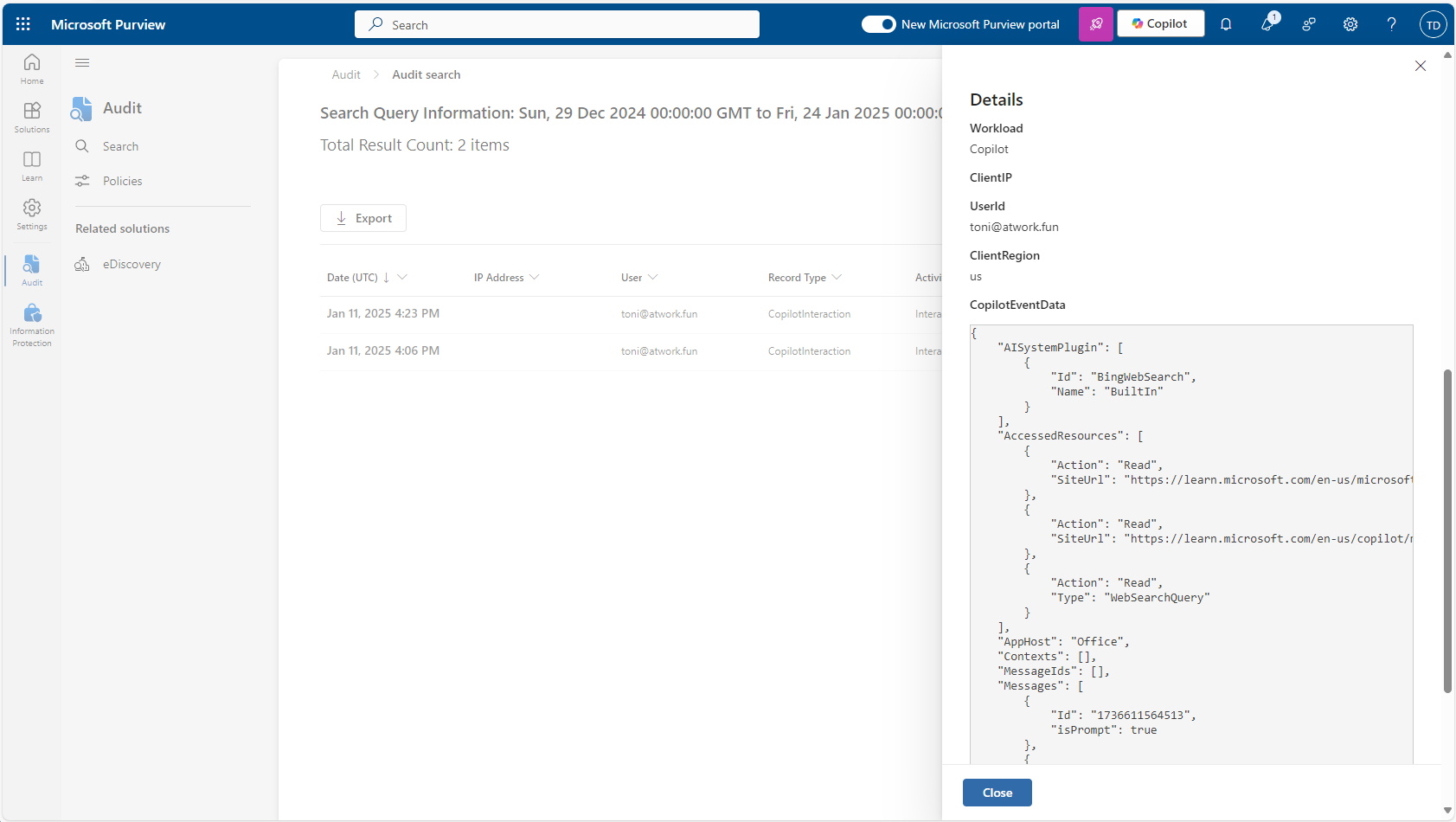 To our rescue: The Microsoft 365 Security Audit Logs provide a comprehensive view of user activities, including interactions with Copilot. These logs capture detailed information about each interaction, such as the user involved, the time of the interaction, and the specific actions taken. This level of detail is essential for administrators who need to monitor usage patterns, identify potential issues, and ensure compliance with organizational policies. Thankfully, access to M365 Copilot can also be found here. ## Search in the Purview Portal
