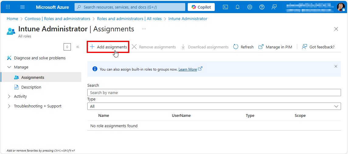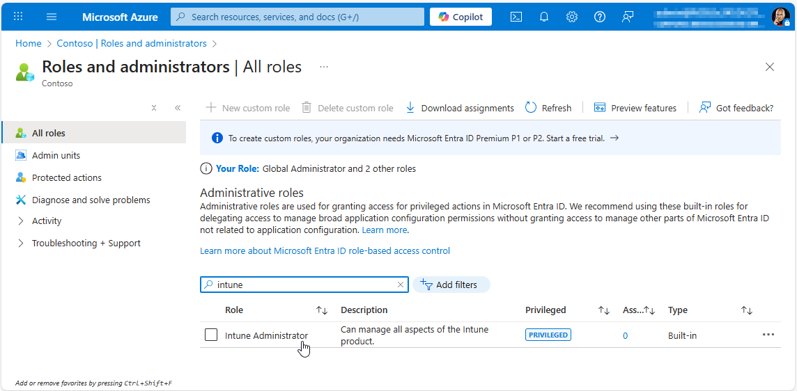 2. Sign in to the Azure portal as Global Administrator or Application Administrator. 3. Open the Microsoft Entra ID menu and navigate to Manage / Roles and administrators (App registrations). 4. In the search box search for the required administrative role. Here, we need the Intune Administrator role.