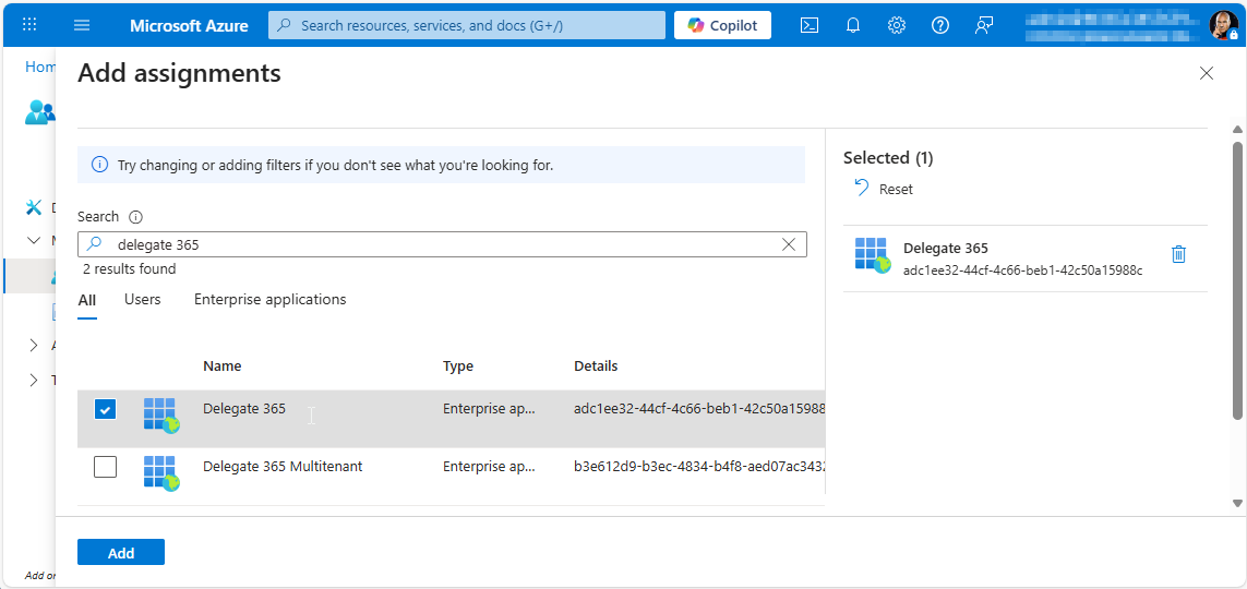 7. Select the Delegate 365 app (the one with your App Id), and click Add. 8. As result, the role assignment has been added to the app, as here. Done.