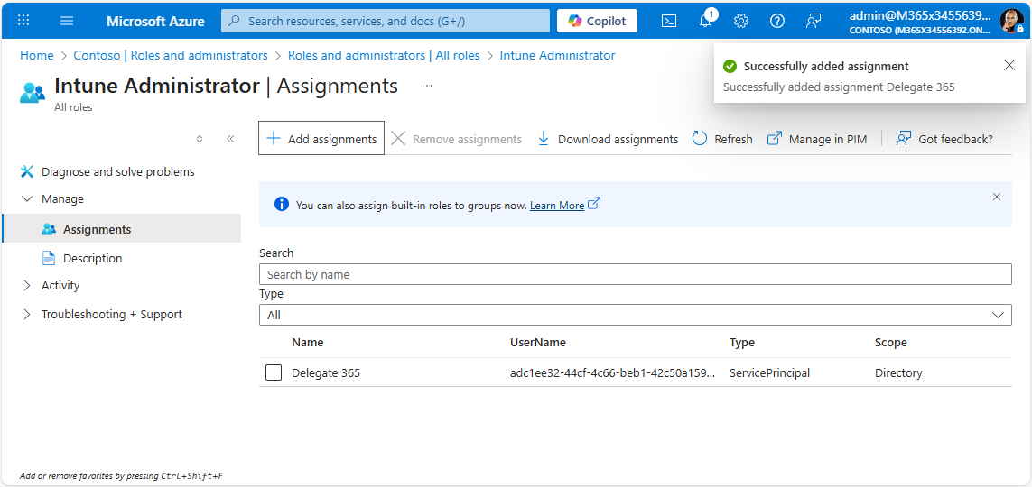 To ensure full functionality in Delegate365, certain roles are required when app permissions alone are insufficient. These roles are automatically assigned during the modern Delegate365 setup process.